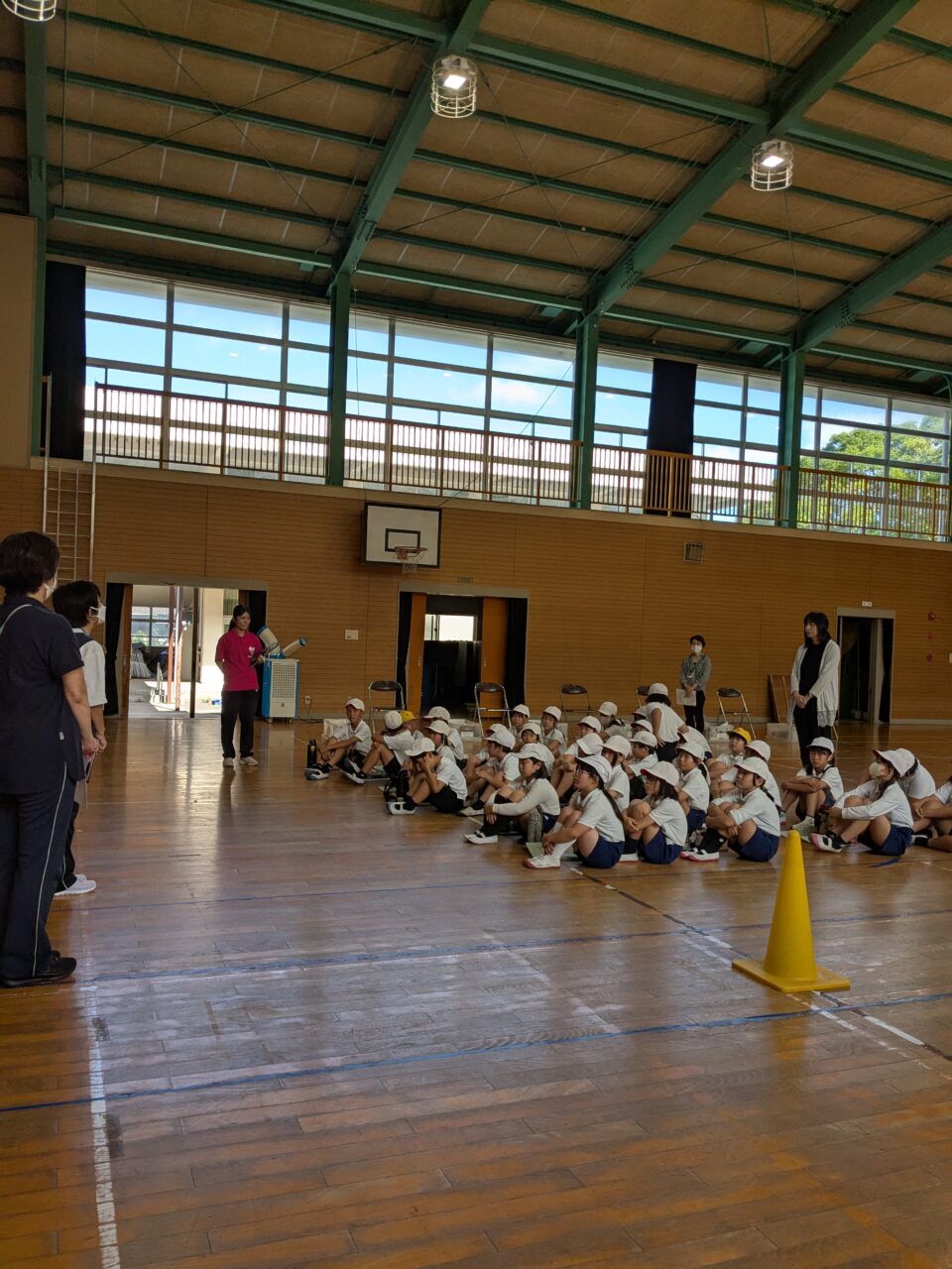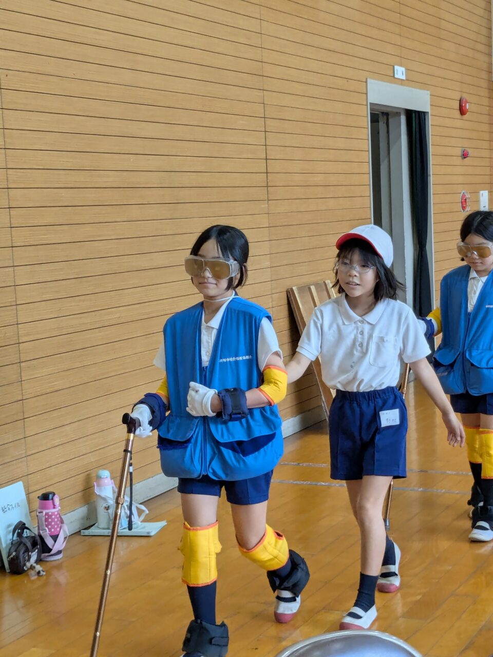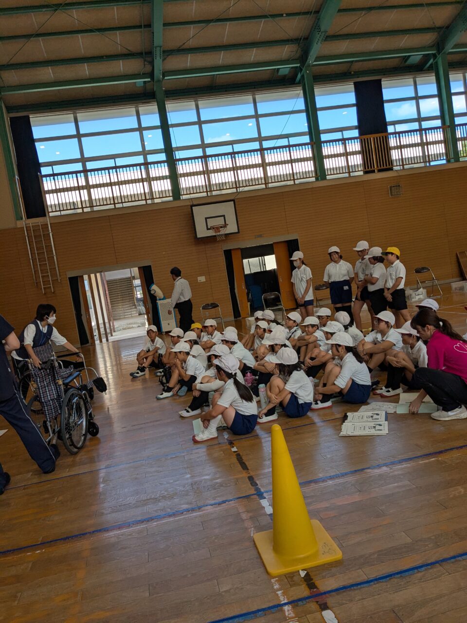 10月とは思えないくらい暑く体育館は、蒸し風呂状態。体中の水分がなくなるのではと思うくらいの汗をかきながら、熱心に取り組む児童の皆さんの、福祉に対する姿勢に、只々感心するばかりです。「お年寄りは大変」「おじいちゃんが毎晩腰をたたけという意味がわかった」「介護する人すごいと思った」「おばあちゃんが猫背なのがわかった」4年生なりの感想が聞けました。