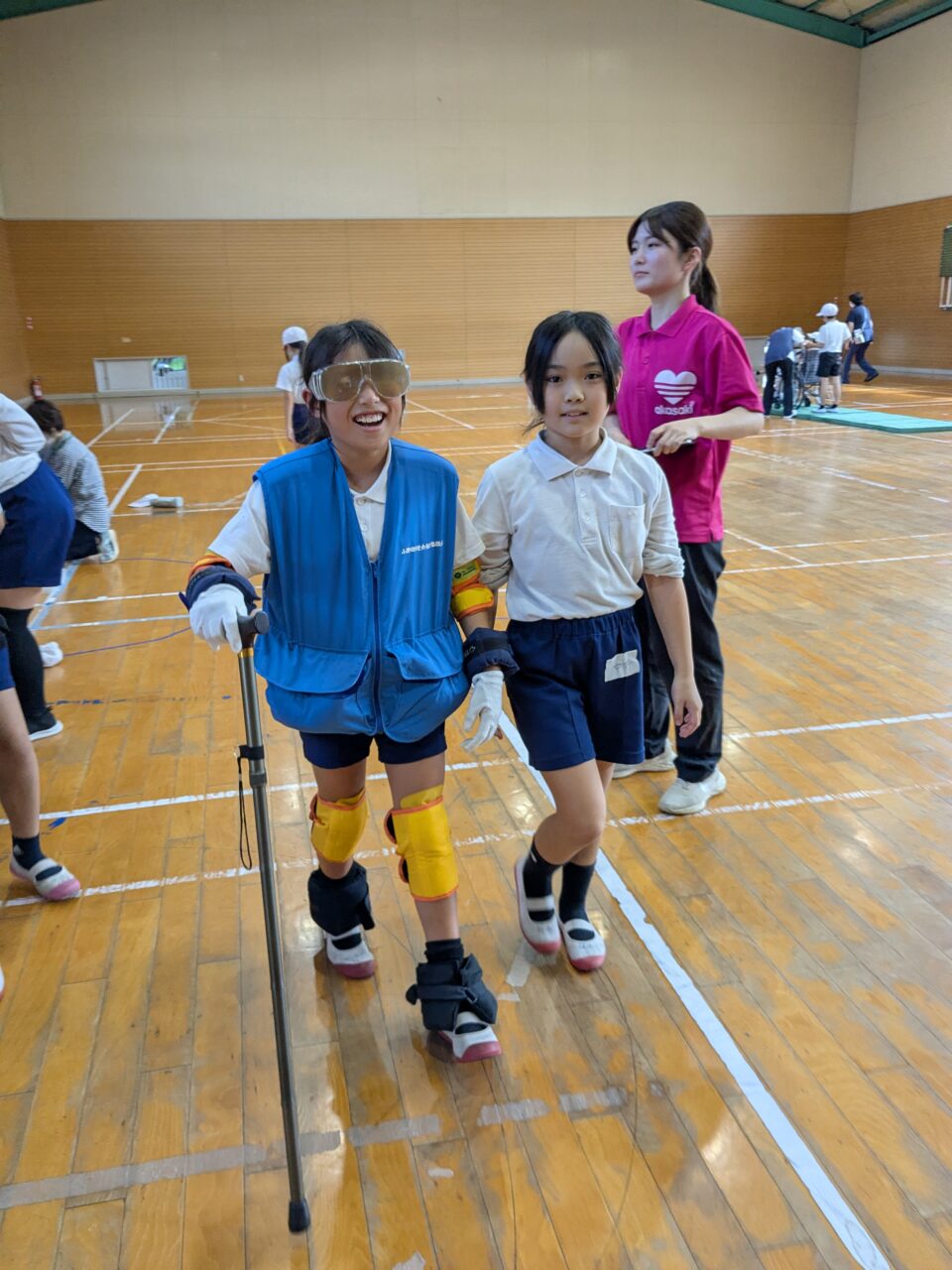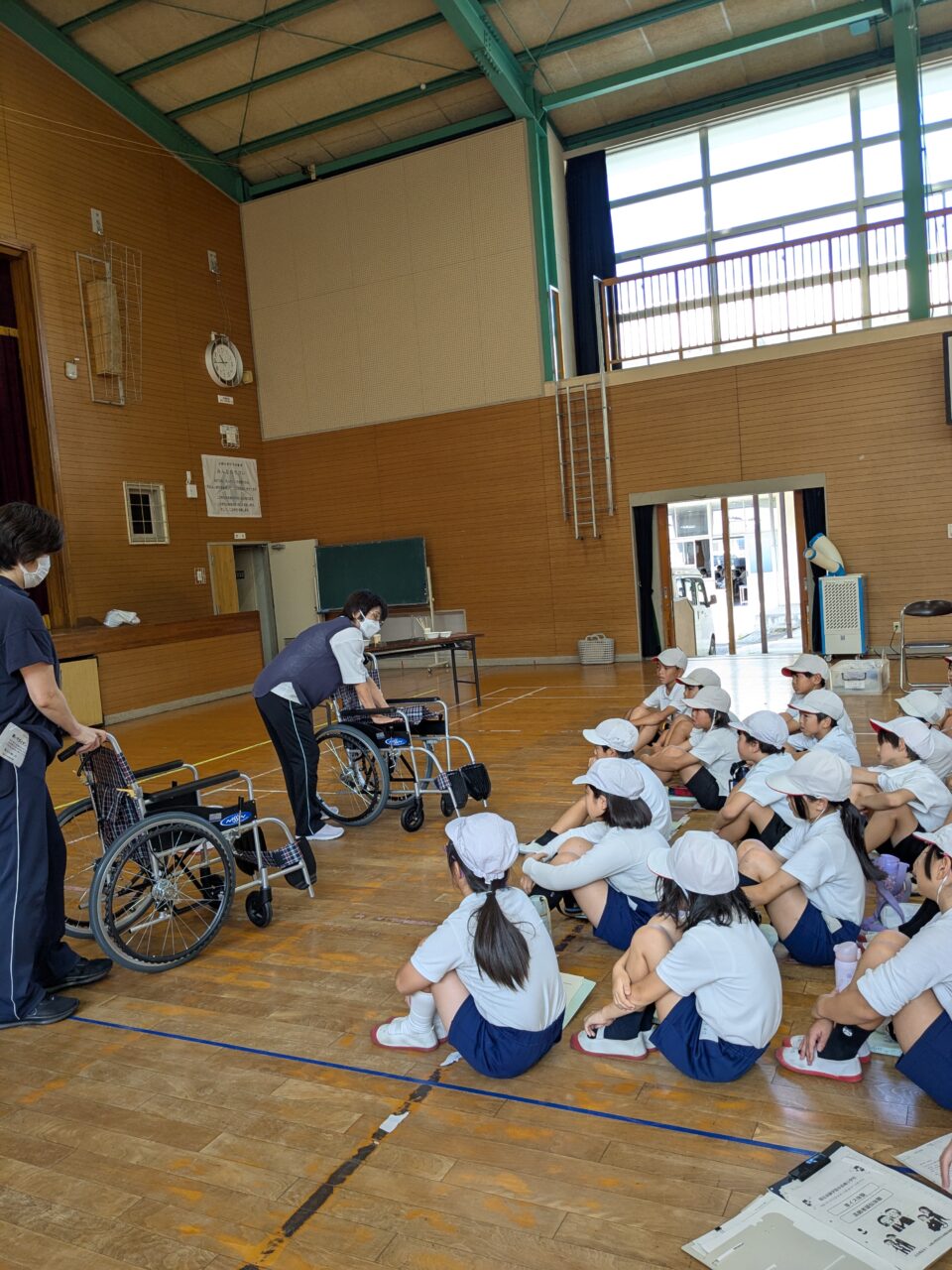 赤崎小学校福祉体験学習授業に行って参りました。元気いっぱいの4年生33名と車椅子、高齢者疑似体験学習を行いました。