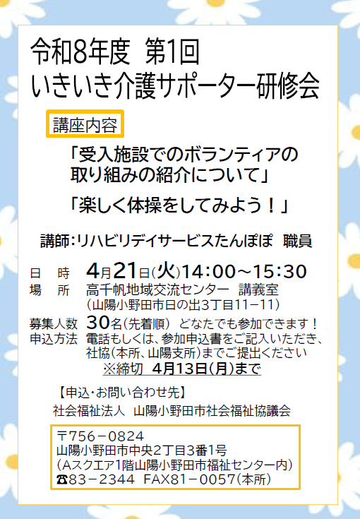 令和8年度 第1回いきいき介護サポーター研修会の参加者募集について